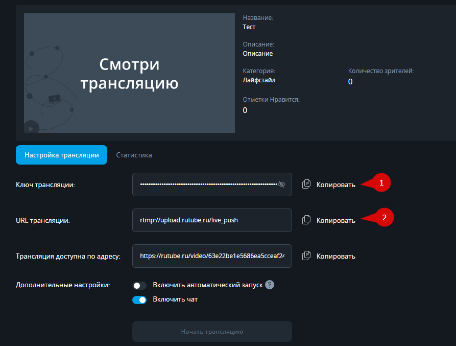 Скопируйте "Ключ трансляции" и "URL трансляции"