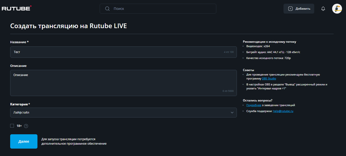 Нажмите "Добавить" -> "Создать трансляцию"