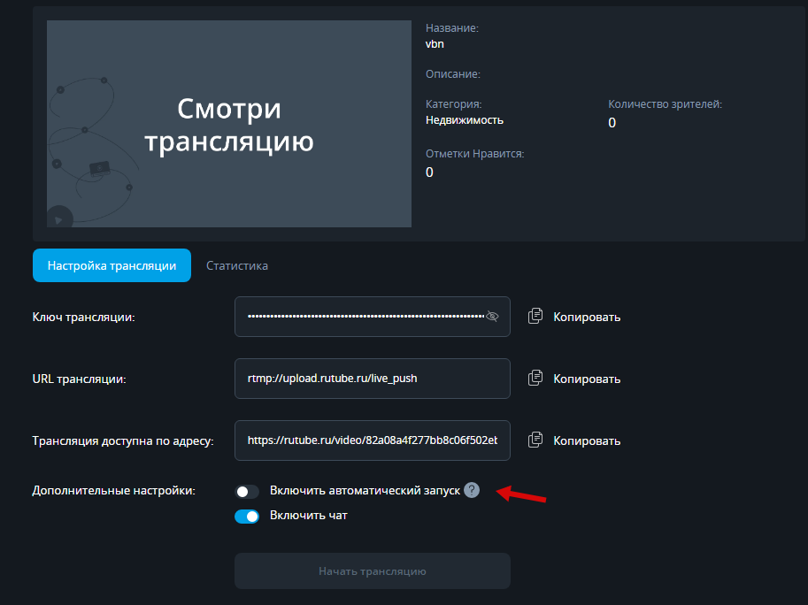 Если опция на РуТуб "Включить автоматический запуск" выключена, то сначала вам нужно запустить трансляцию в OBS, затем нажать кнопку "Начать трансляцию". Если включить эту опцию, то трансляция начнется автоматически при запуске в OBS.