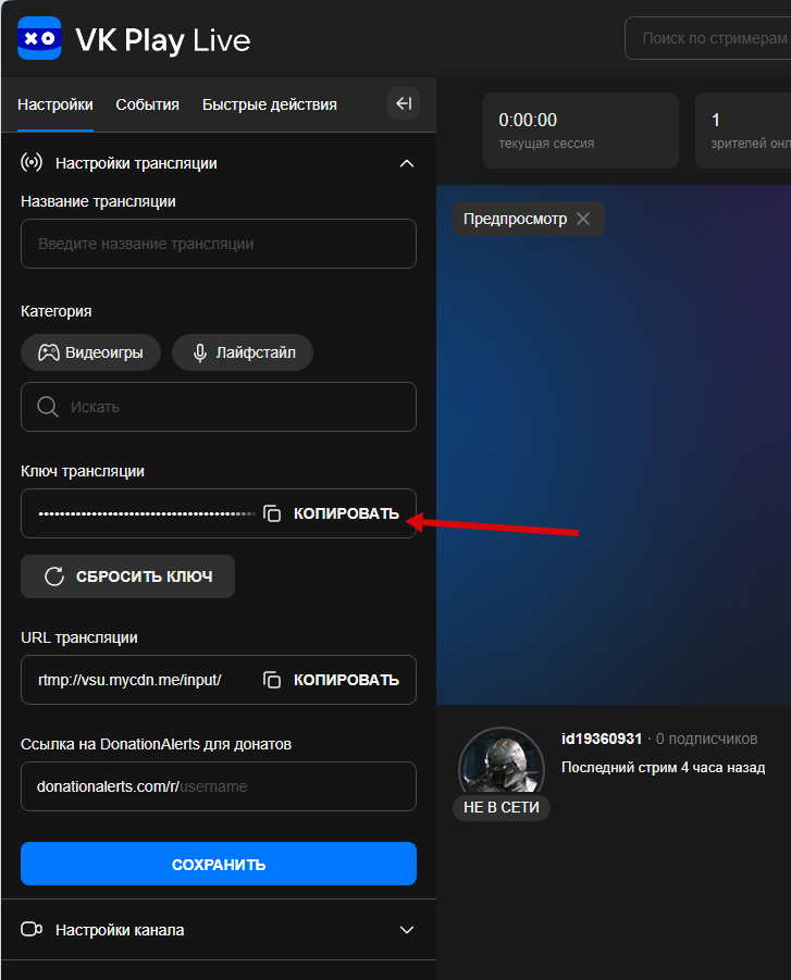 Откроется окно, в которое нужно вставить данные из VkPlay. Оставим эту страницу открытой и перейдем на [https://vkplay.live/](https://vkplay.live/streamvi/studio)