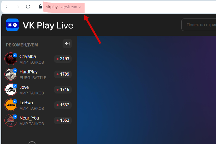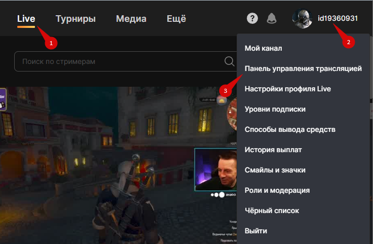 Вернитесь на <https://vkplay.live>, зайдите в раздел "Live", нажмите на ваш профиль и перейдите в "Панель управления трансляцией"