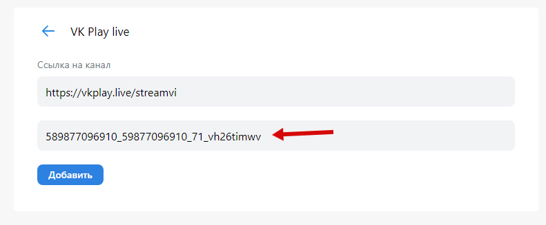 Вставьте данные в поле "Ключ" на открытой ранее странице StreamVi, нажмите "Добавить"